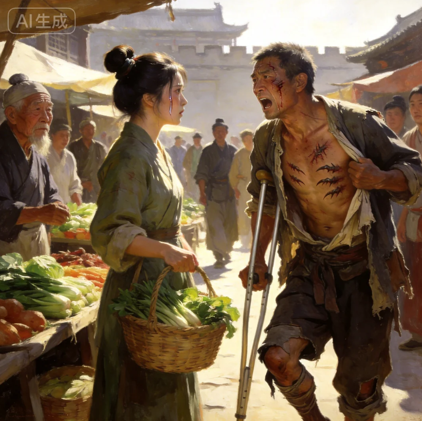 红莲的菜篮“啪嗒”掉在地上,她抖着手摸出贴身藏着的绣花钱袋——里面是她攒了半年的月钱。她将一枚铜钱轻轻放进汉子的破陶碗,又在众人惊愕的目光中,掏出双倍菜钱塞给卖菜老汉。
